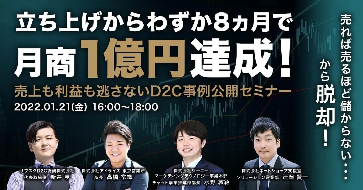 | タイトル | 【売れば売るほど儲からない・・・から脱却!】 立ち上げからわずか8ヵ月で月商1億円達成!売上も利益も逃さないD2C事例公開セミナー |